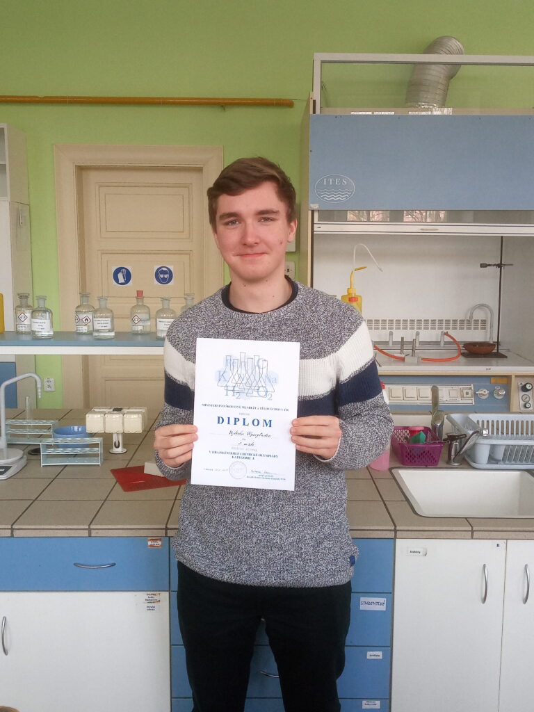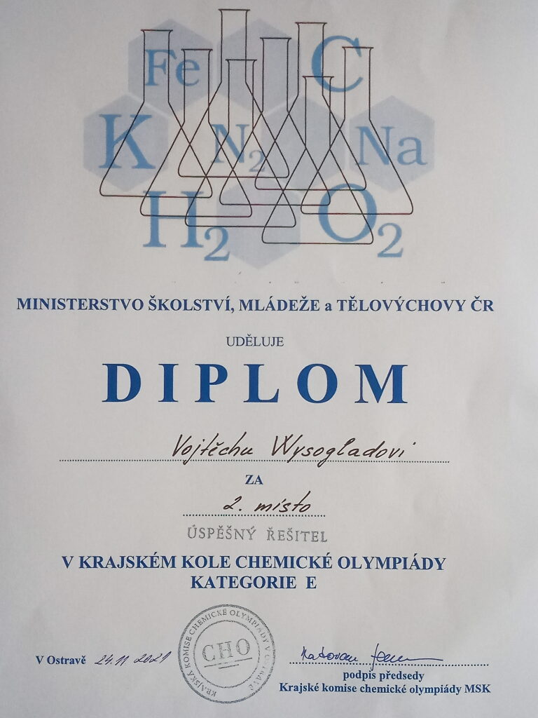 Velká gratulace Vojtěchu Wysogladovi ze třídy 4.C k úžasnému celkovému 2. místu v krajském kole chemické olympiády kategorie „E“. V této kategorii jsme jako škola soutěžili vůbec poprvé. Kategorie je určena pro žáky 3. a 4. ročníků středních odborných škol s chemickým zaměřením, a proto je tento úspěch o to cennější.