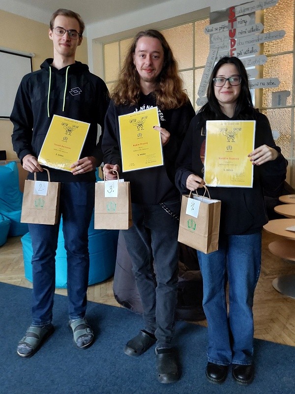 Letos se zapojilo celkem 11 žáků ze tříd 1.A, 1.C, 1.L, 2.L, 4.A, 4.L. Po třech kolech obsahujících celkem 24 zapeklitých hlavolamů různých typů získali: