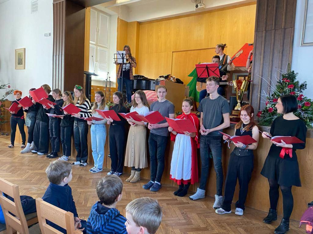 Studenti pěveckého sboru naší školy přivítali v aule děti z mateřských školek. Zazněla zpívaná pohádka Červená Karkulka a nechyběly ani vánoční koledy, které si všichni společně zazpívali.
