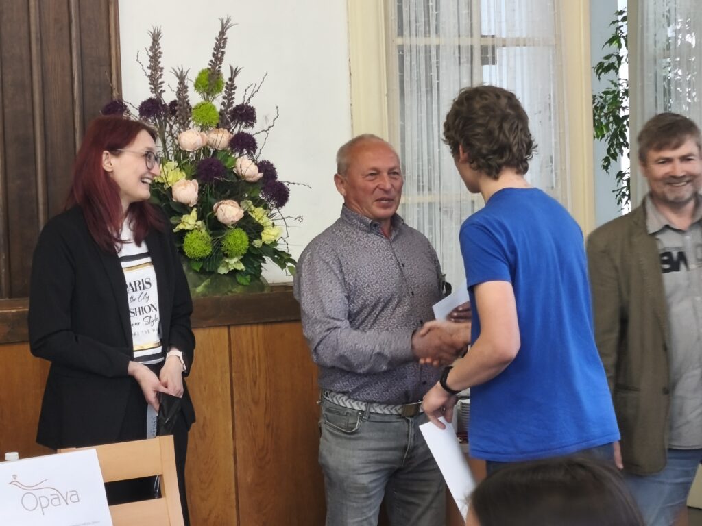 Věcné ceny a poukázky medailistům předávali Ing. Eva Dostálová, zástupce vedoucí odboru školství Magistrátu města Opavy a Ing. Josef Teuer, předseda územního sdružení Českého zahrádkářského svazu v Opavě.